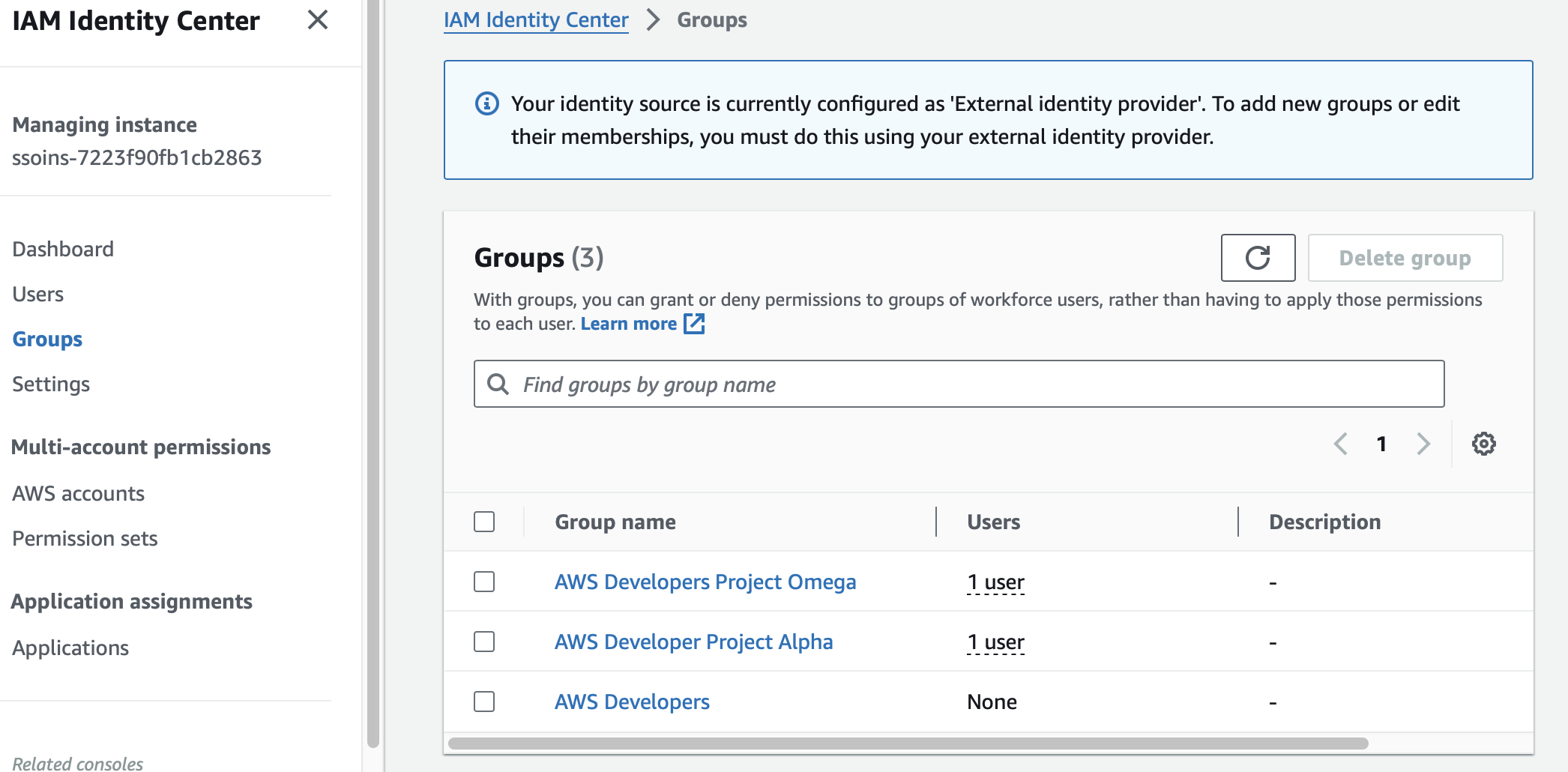 Here’s how this example would show on the Groups screen in IAM Identity Center: