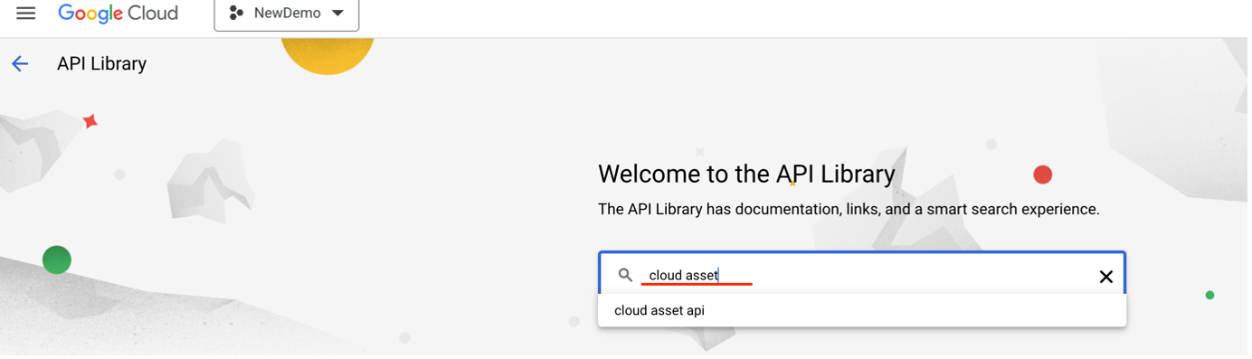 In the search bar, enter the name of the API you want to enable (for example, “Cloud Asset Inventory”):