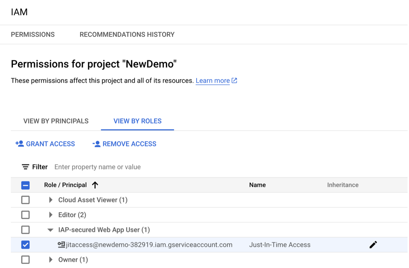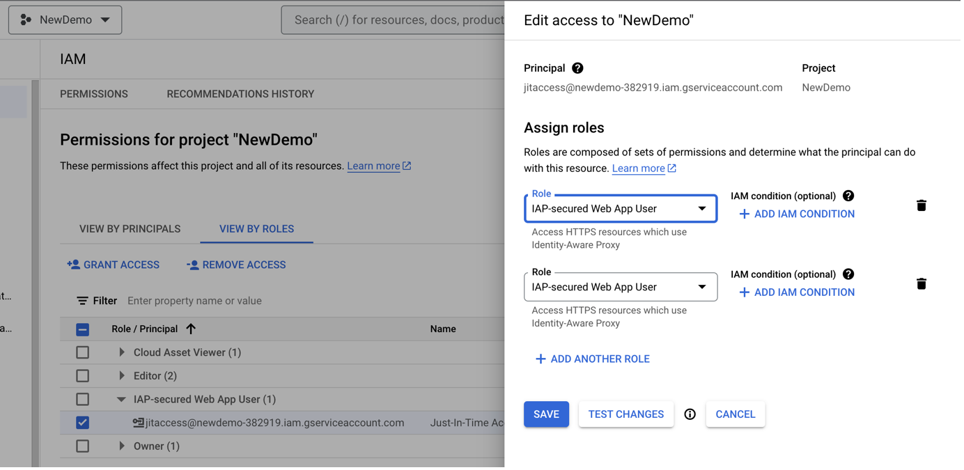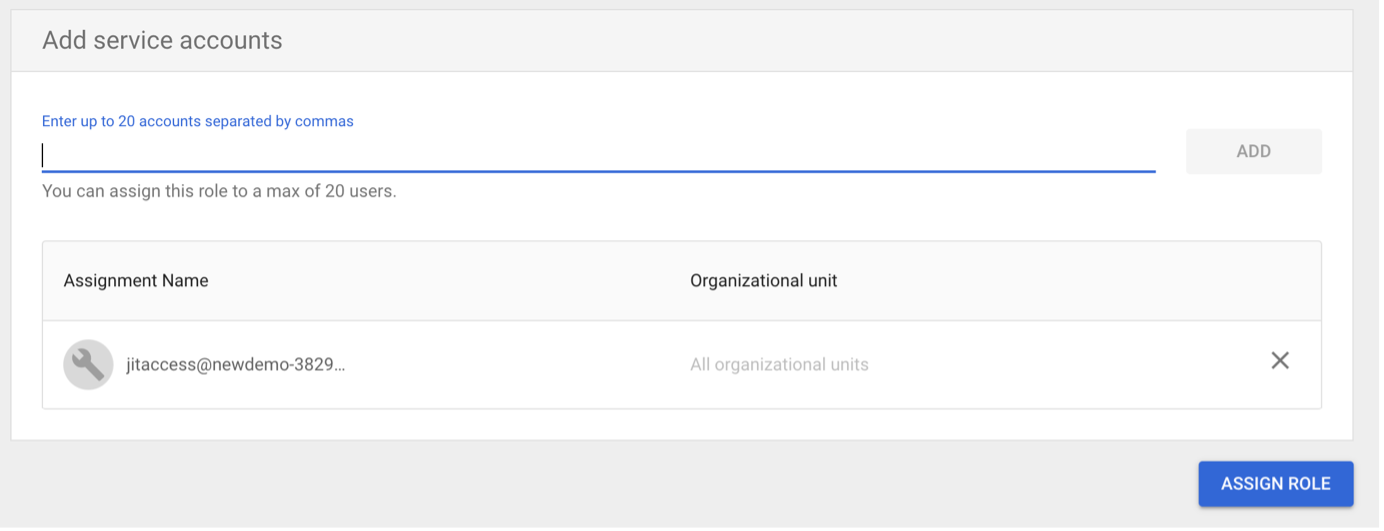 Enter “jitaccess@newdemo-382919.iam.gserviceaccount.com”, replacing “newdemo-382919” with your project name, then click ADD, followed by ASSIGN ROLE: