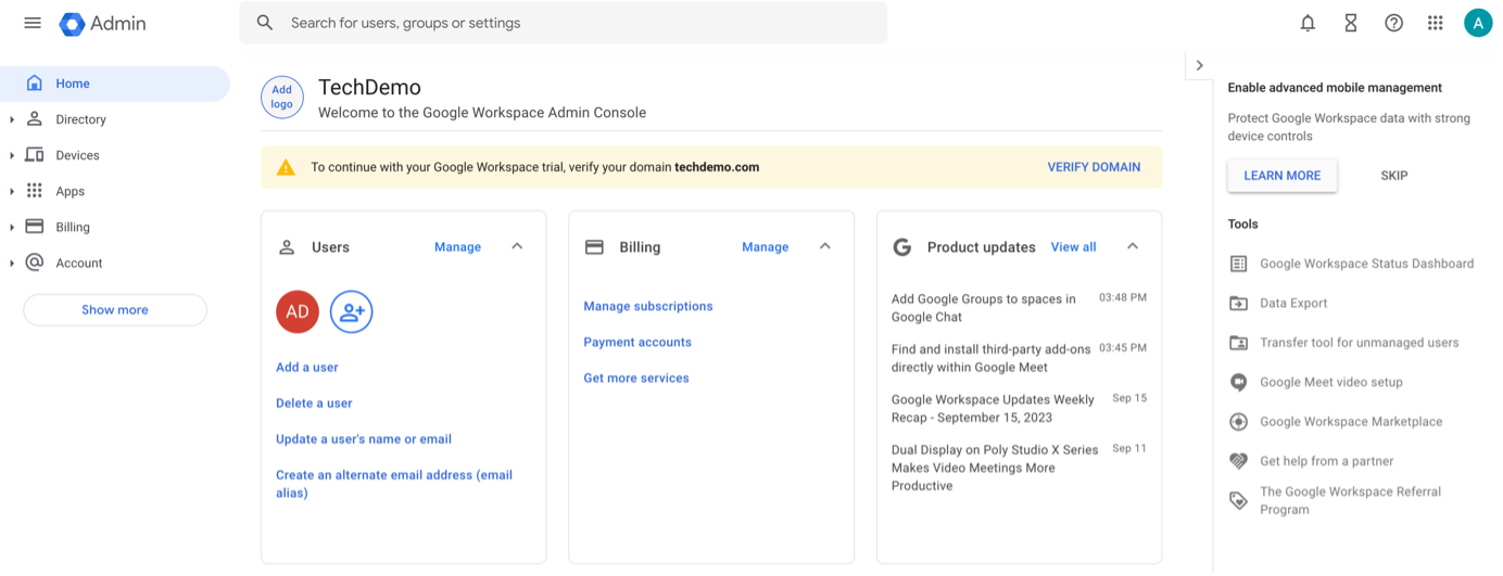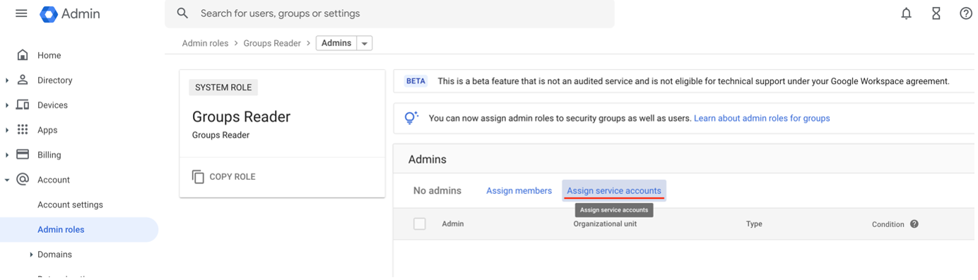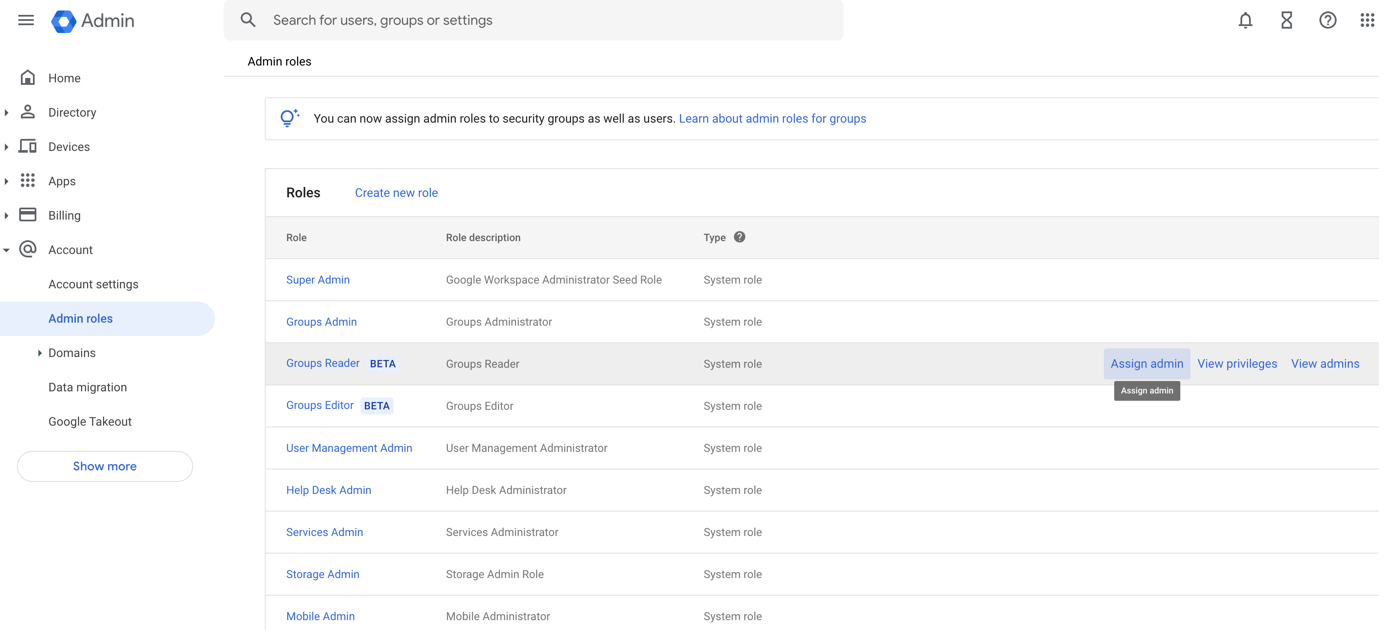 In the Admin console, expand the Account drop-down menu and click Admin roles.