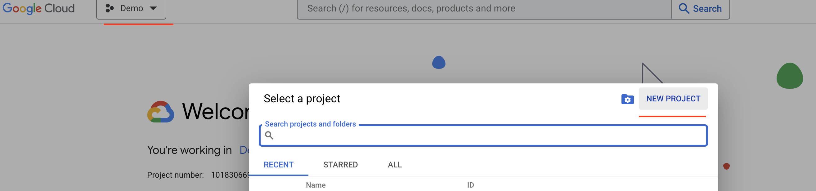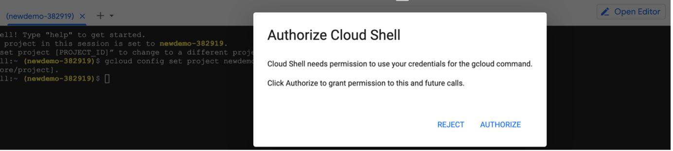 Open Google Cloud Shell and set the environment variable for your project. Run the following command, replacing “newdemo-382919” below with your project name if you used a different name: