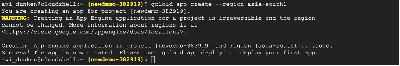 First, open Cloud Shell and create an App Engine application. Choose the region closest to your physical location, then use the “gcloud app create” command: