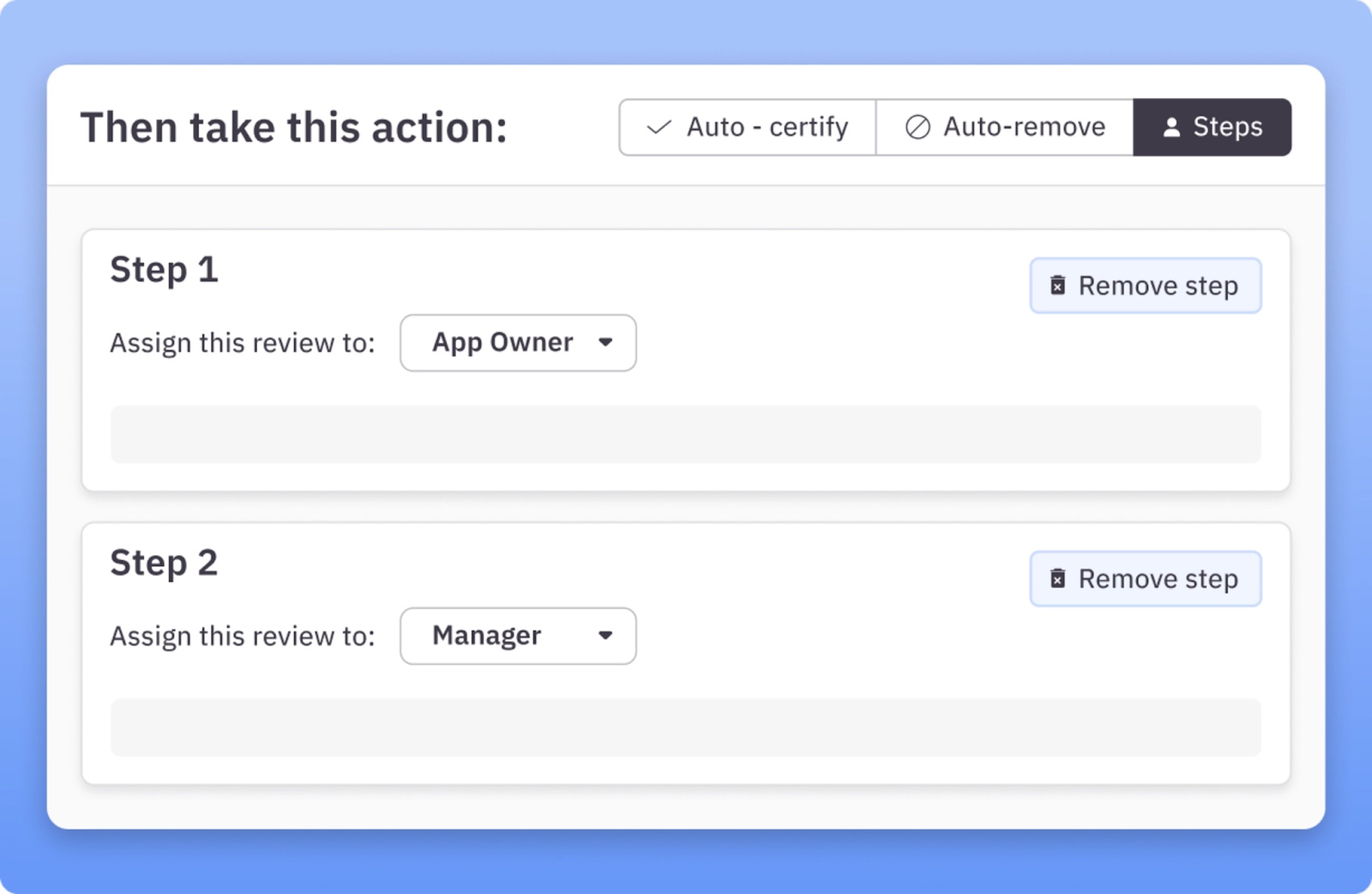 - Configure policy-driven access controls. Create zero-touch, conditional, and multi-step approval policies. Remove access based on time, non-usage, or changed justification. Force a re-request for especially risky access.