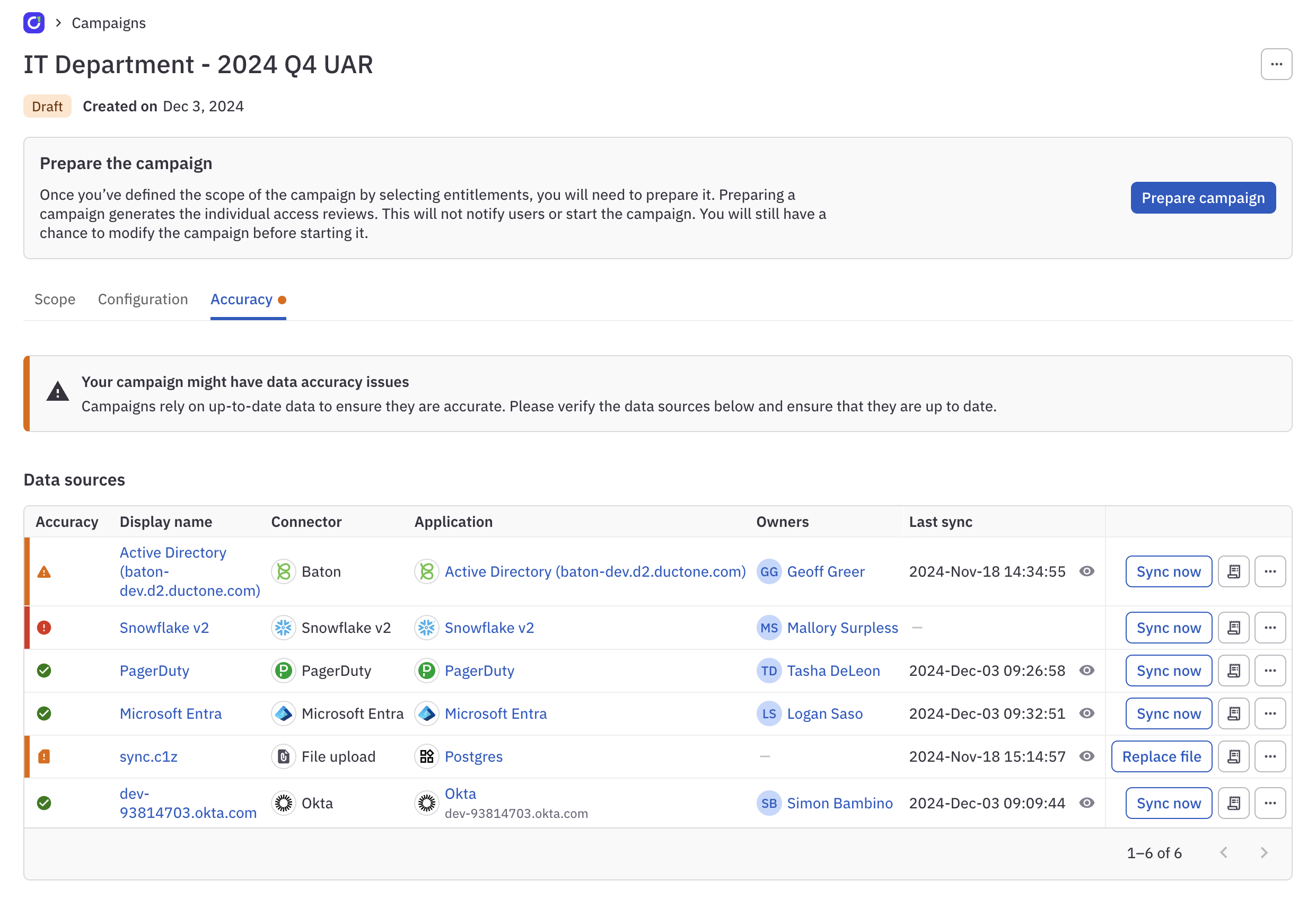 All data sources for your campaign are shown in the Data sources table. ConductorOne flags data sources when: