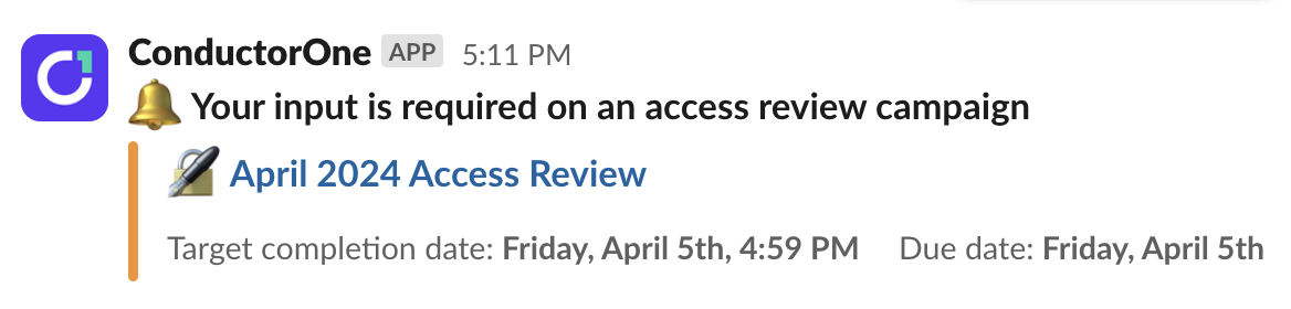 During an access review campaign, the campaign owner can send notifications to fellow campaign owners and reviewers in a new or existing Slack channel.