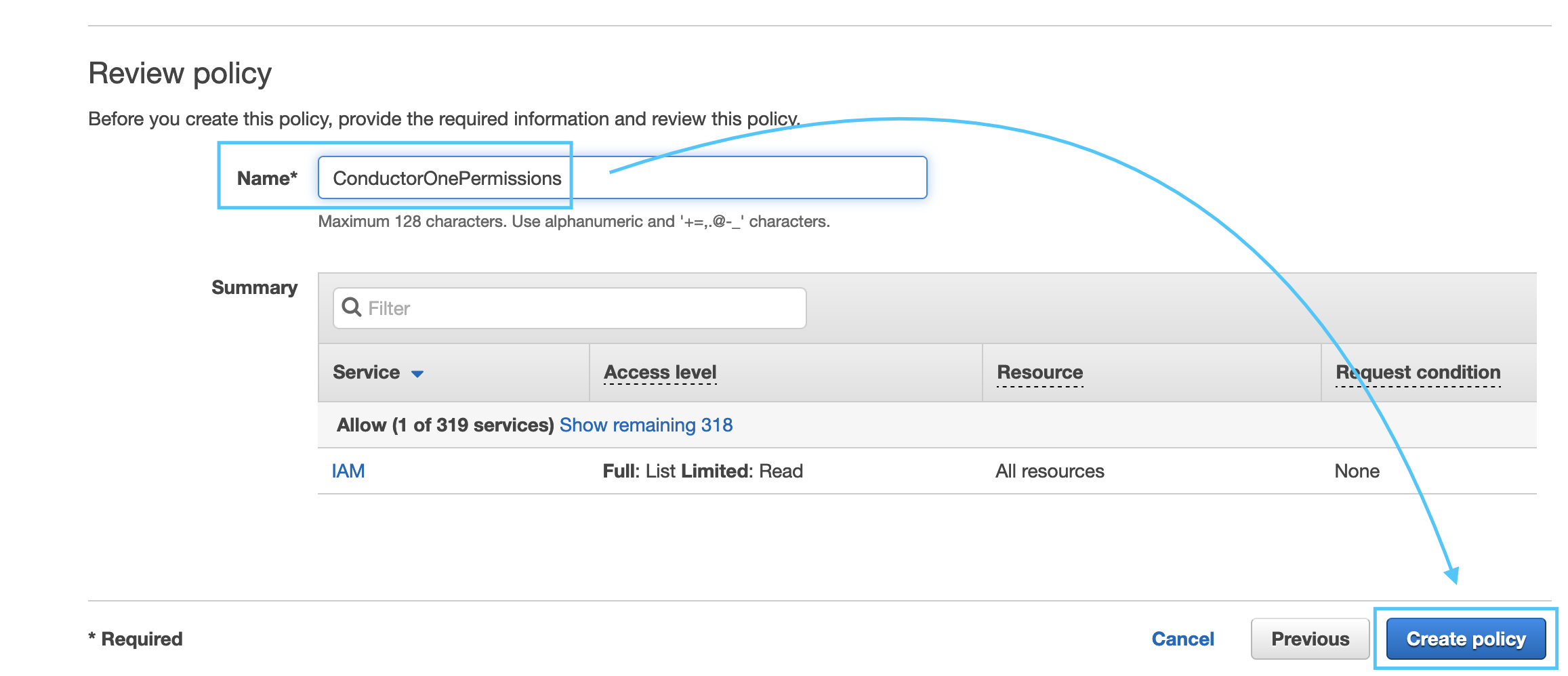 Give the policy a name, such as ConductorOnePermissions and click Create Policy.