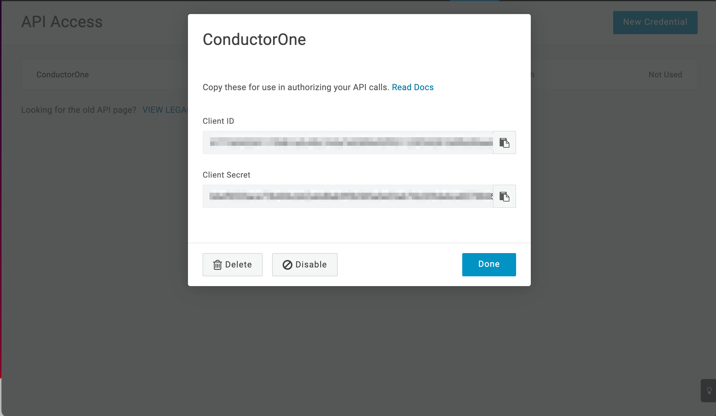 When the new API credential is created, copy and save the Client ID and Client Secret.