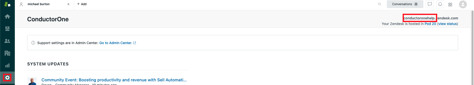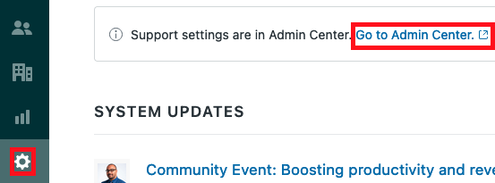In your Zendesk account, navigate to the Admin page by clicking the gear icon in the left menu bar.