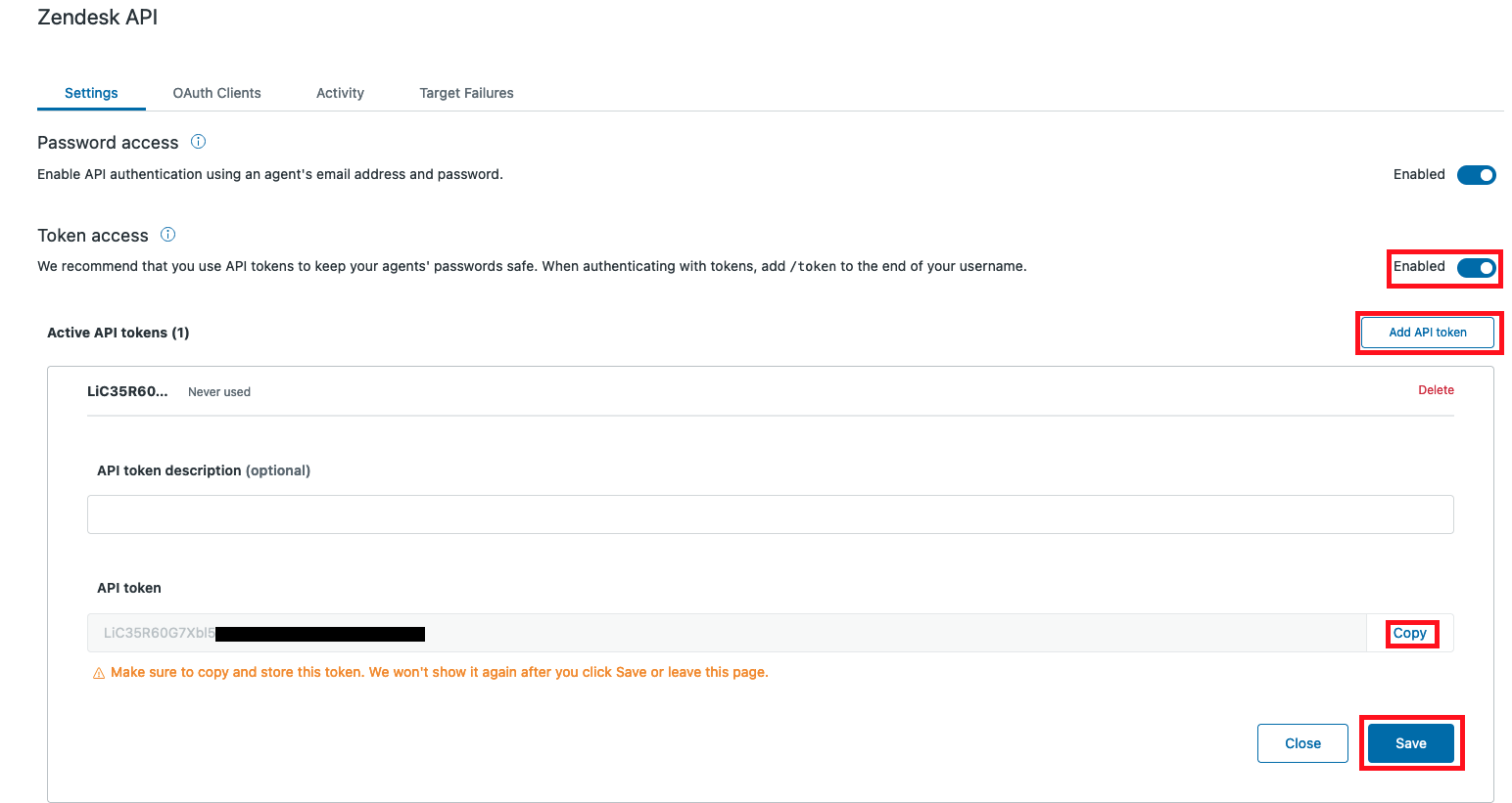 Click Add API token, then copy and save the newly created token.