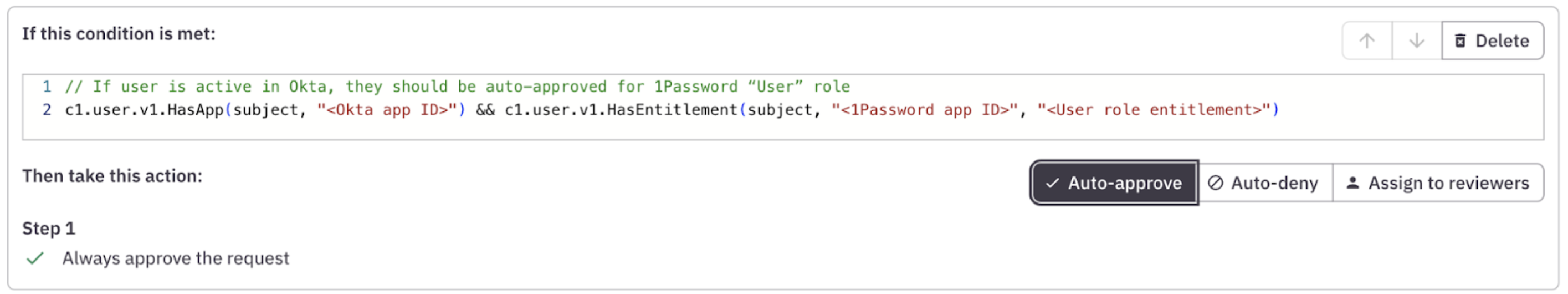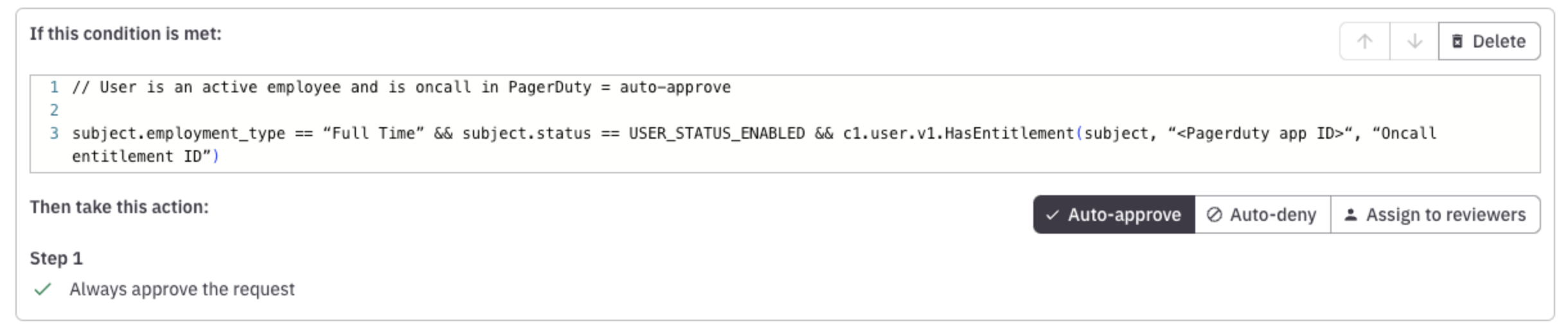 Conditional policies take the context of a request or review and automatically build this into the approval workflow for more flexibility without compromising on security. For example, you may want to automate providing on-call engineers with quick access to sensitive resources. Or you may want to send contractors through a different review process. Let’s dive into some of the most common use cases!