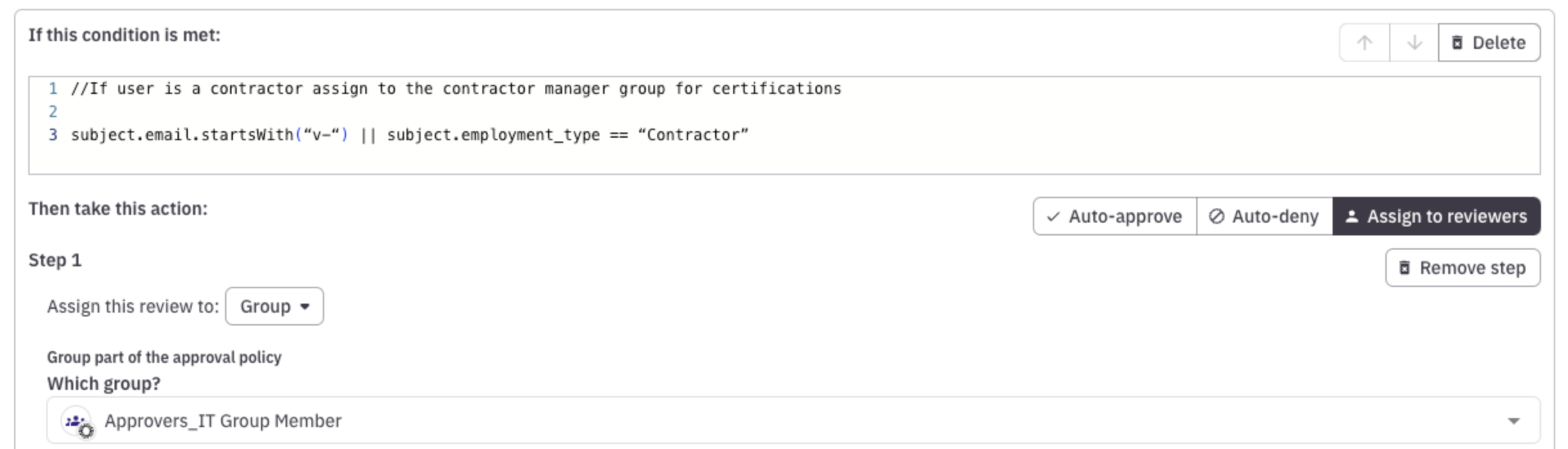 The options for conditions used in policies are endless, but another example of a common use case is making a reviewer decision based on the user’s attributes, such as whether they are a contractor or not. In this case, the request can be automatically routed to a group approval that always handles contractor access.